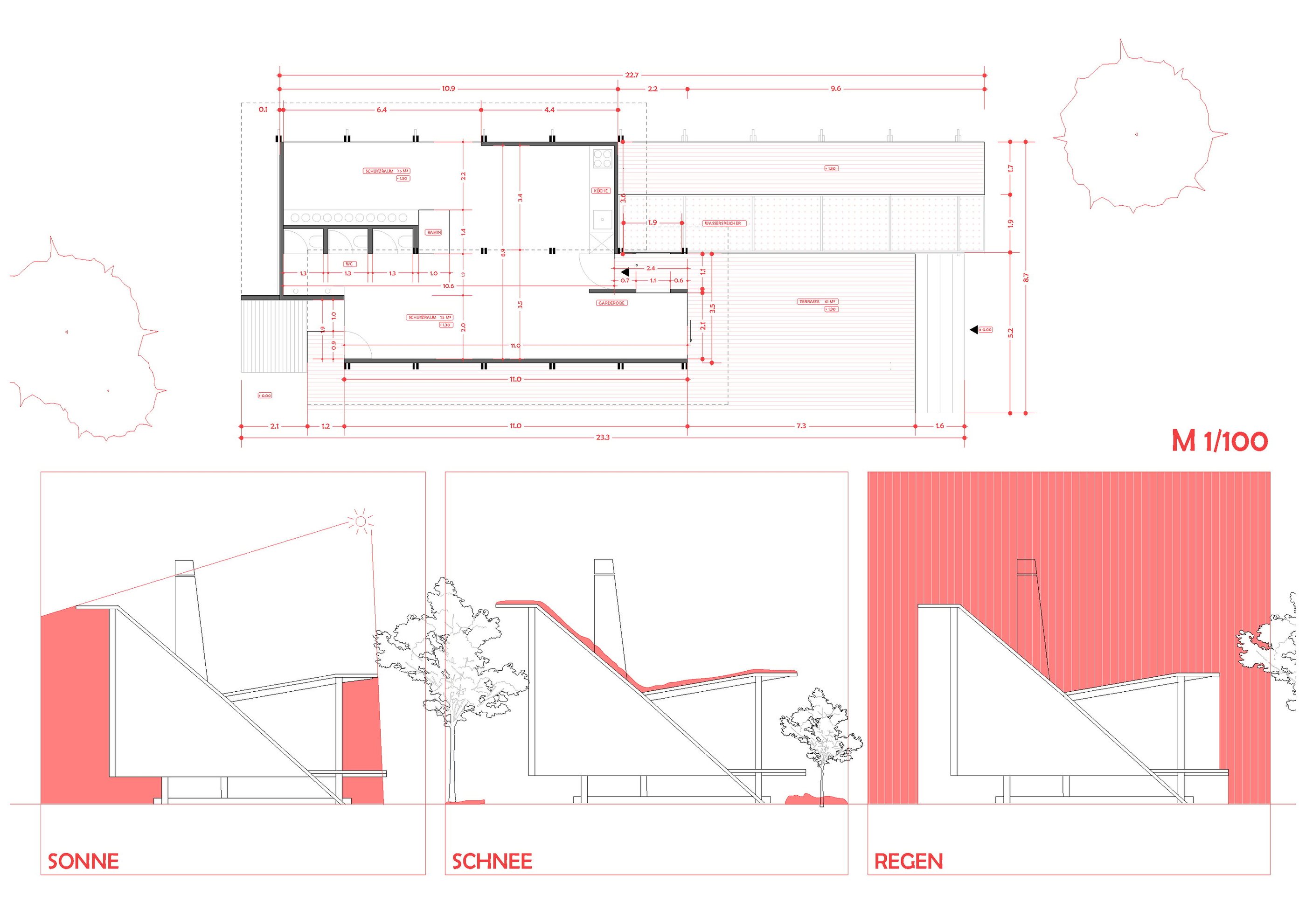 Dieses Projekt ist ein natürlicher Kindergarten am Rande eines Waldes, bei dem die Architektur als Lehrer fungiert. Das Dach dient als Lehrmittel und zeigt den Kindern, wie die Natur funktioniert. Es bietet Schutz vor Regen, Sonne und Schnee, während das Wasser vom Dach in einen Behälter geleitet wird, aus dem die Kinder lernen können, wie man Wasser speichert und nutzt. Im Inneren gibt es einen umprogrammierten Raum, den die Kinder frei nutzen können, wie sie möchten. Der Komorebi Kindergarten zielt darauf ab, verantwortungsbewusste, kreative und nachhaltig denkende Individuen zu fördern und setzt sich das Ziel, möglichst klimaneutral und umweltbewusst zu agieren.