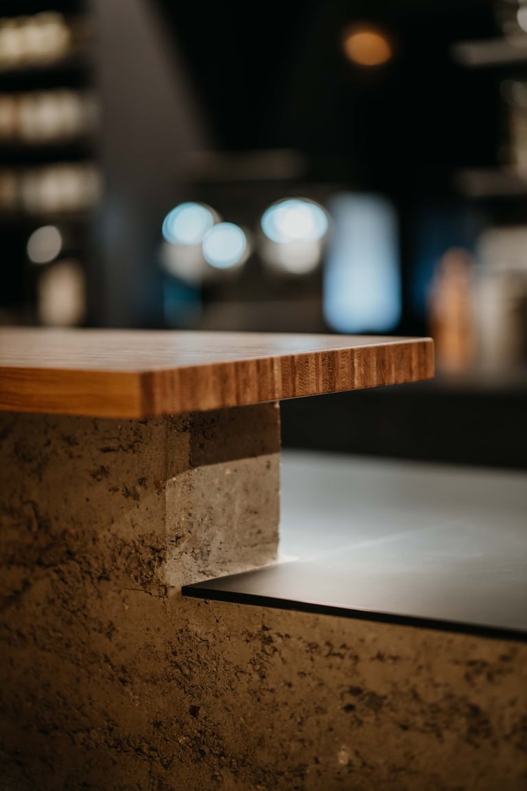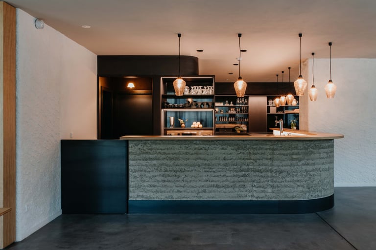 Die Bar wirkt durch sanfte Rundungen anstelle scharfer Kanten gemütlich und präsent. Natürliche Materialien wie Holz und Lehm fördern eine ruhige, warme Atmosphäre und unterstreichen das Engagement für Nachhaltigkeit. Die meisten Materialien wurden rohgelassen, was nicht nur eine schöne, natürliche Ästhetik schafft, sondern auch die Baukosten mindert. Unbehandelte Materialien wie schwarzer Stahl und Stampflehm verstärken dieses Ambiente