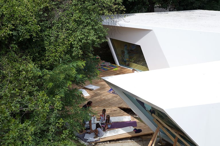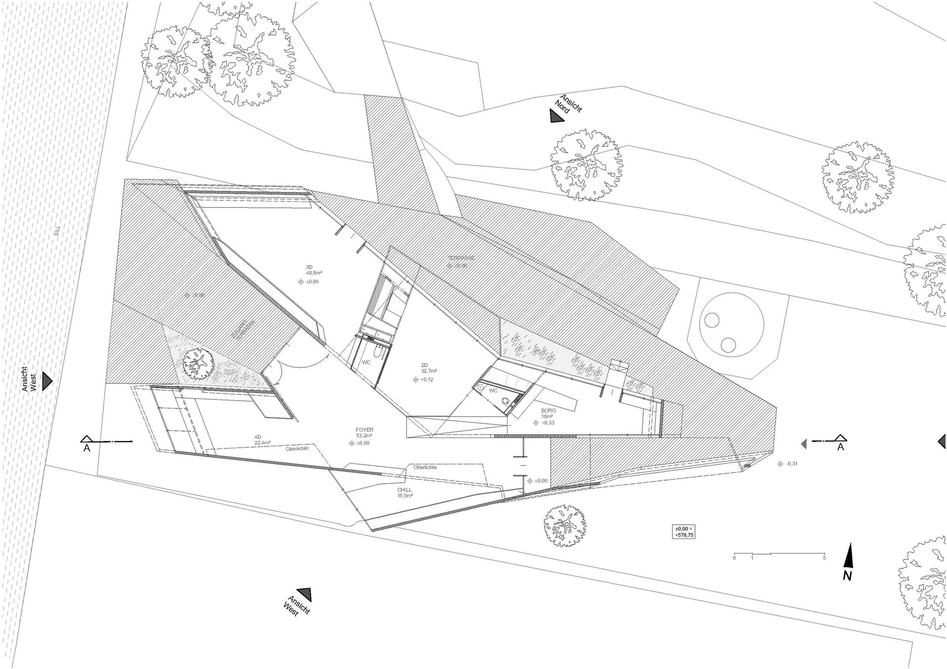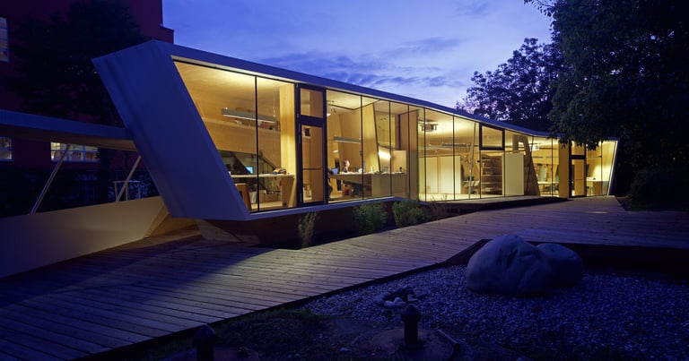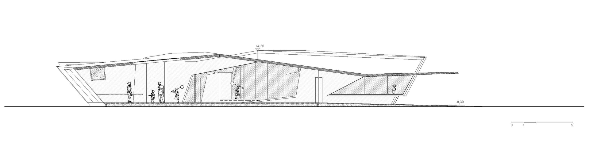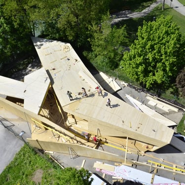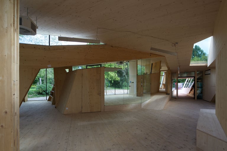Wir, die Studierenden, haben es durch unseren Arbeitseinsatz möglich gemacht, dass das bilding in knapp fünf Monaten kostengünstig und mit einfachen Mitteln realisiert werden konnte. Entstanden ist ein pavillonartiges Werkstättengebäude, das nicht nur den Kindern und Jugendlichen als NutzerInnen ein optimales Raumangebot bietet, sondern auch den Park durch seine einzigartige Architektur bereichert. Vorgelagerte Terrassen und raumhohe Glasfronten verbinden den geschwungenen Baukörper mit der Umgebung, im Inneren bilden schräge Böden und Wände ein fließendes Kontinuum an Räumen mit unterschiedlichen Atmosphären und Arbeitsmöglichkeiten.