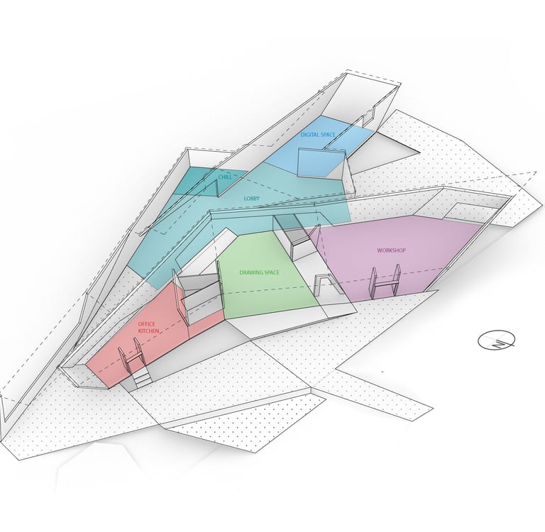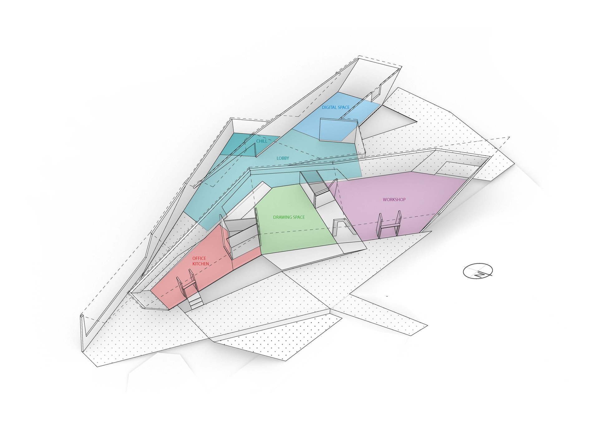 Ausgehend von der konzeptionellen Vorarbeit, die ein ArchitektInnenkollektiv rund um das aut für die Planung dieses Werkstättengebäudes leistete, wurde die weitere Entwurfsarbeit von uns, den Studierenden des ./studio3, übernommen. Aus den 17 Projekten, die im Rahmen einer Bachelorarbeit – betreut von Walter Prenner, Verena Rauch und Wolfgang Pöschl – vorgeschlagen wurden, wählte eine Jury im Dezember 2014 das Projekt von Niklas Nalbach zur weiteren Bearbeitung aus. In Zusammenarbeit mit zahlreichen Firmen und dank der unentgeltlichen Leistung von Statikern, Architekten und Fachplanern wurde dieses Projekt im Kollektiv zur Baureife entwickelt und ab Mitte April 2015 auf dem von der Stadt Innsbruck zur Verfügung gestellten Bauplatz umgesetzt.