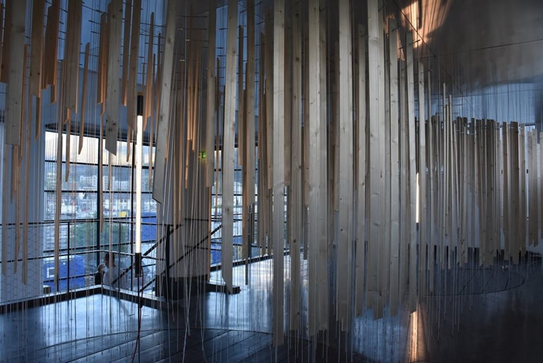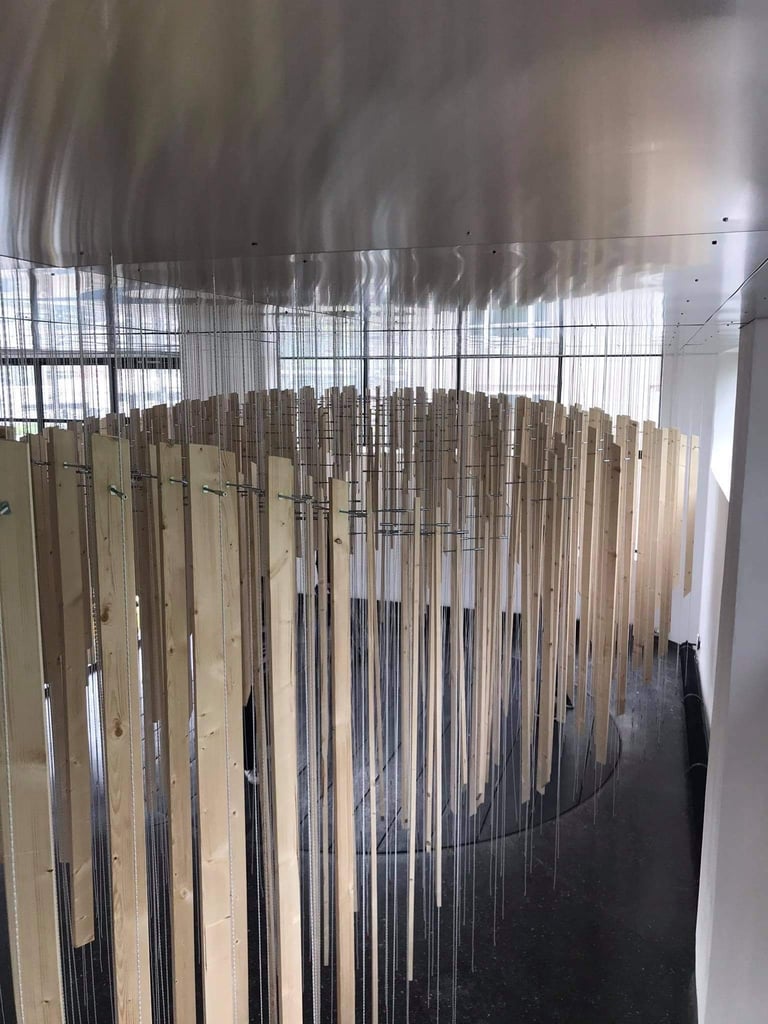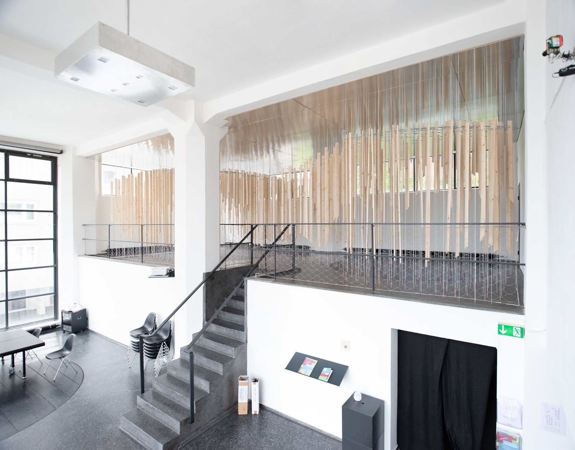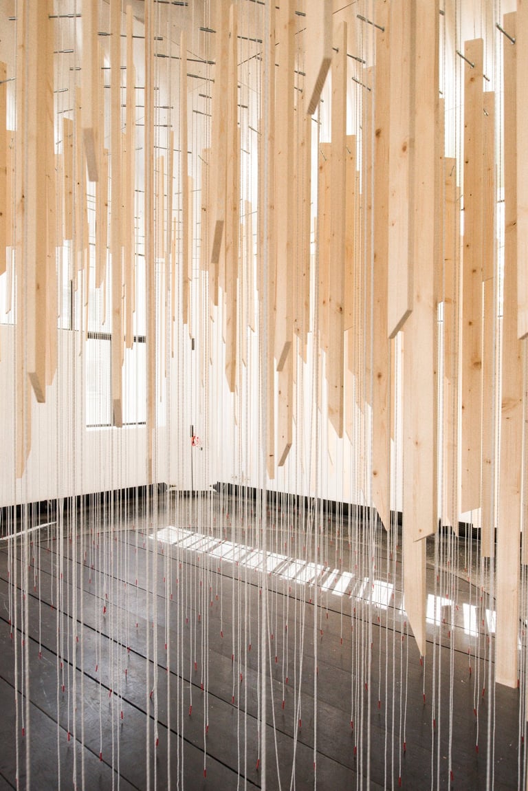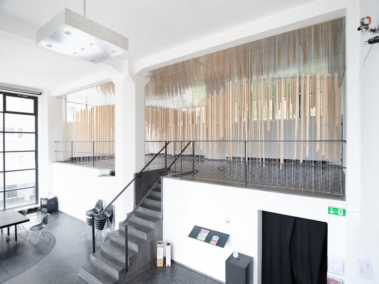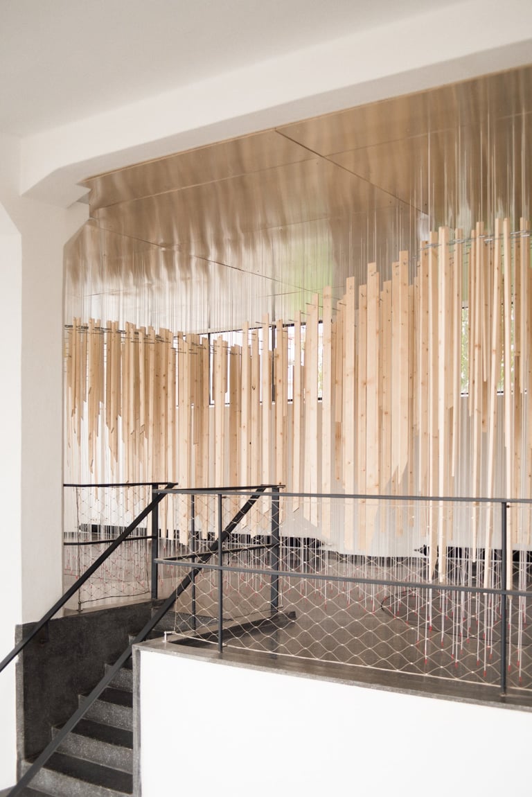 In der digitalen Medienwelt fehlt oft der direkte, körperliche Kontakt und die unmittelbare physische Begegnung. Die Erfahrungen, die über die rein optisch-akustische Wahrnehmung hinausgehen, bleiben auf der Strecke. Besonders spürbar wird dieser Verlust durch das „physical distancing“, das in der Architektur- und Raumerfahrung oft Sehnsüchte weckt. Genau diese Verluste und Sehnsüchte greift die Rauminstallation auf, die Besucher*innen zu aktiven Teilnehmer*innen macht und ihnen eine synästhetische Raumerfahrung ermöglicht. Statt passiv zu beobachten, tauchen die Besucher*innen beim Betreten und Erleben der mit Seilen und Holz gestalteten Installation in eine sinnliche Raumerfahrung ein. Durch das gestalterische Mittel der Uneindeutigkeit entsteht ein spannungsvolles Verhältnis zwischen dem Objekt und den Besucher*innen. Was nicht sofort verständlich ist, weckt Neugier und lädt dazu ein, die Installation eigenständig zu erkunden und zu entdecken.