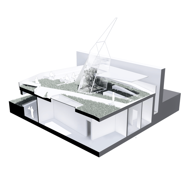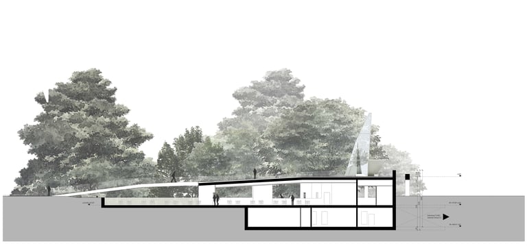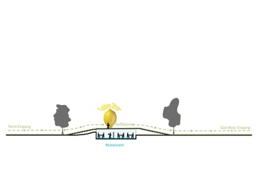 Die Goldene Zitrone bettet sich sanft und respektvoll in die bestehende Landschaftsgestaltung ein. Sie ist als ein integriertes Gesamtwerk (Landschaftsimplantat)zu verstehen. Durch eine neue Wegeführung des Ortes lädt Sie die Besucher/innen ein Sie auszukundschaften auf Ihr zu verweilen, Sie zu überschreiten oder unter Ihrer schützenden Schale einzukehren. Ähnlich wie die Zitrusfrüchte der früheren Orangerie besteht die Goldene Zitrone aus unterschiedlichen Schichten. Schale, Fruchtfleisch und Kern. Kunstlandschaft (Dachlandschaft), Architektur und Kunstpavillon.
